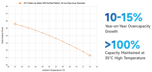 Large-capacity evaporator ensures stable and excess production. Under standard working conditions, output exceeds the rated by 10.75%, and runs at full load even in high-temperature environments. Operating costs are 5%–8% lower than the industry average.